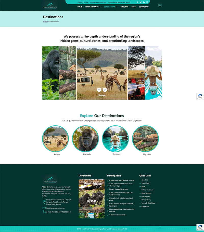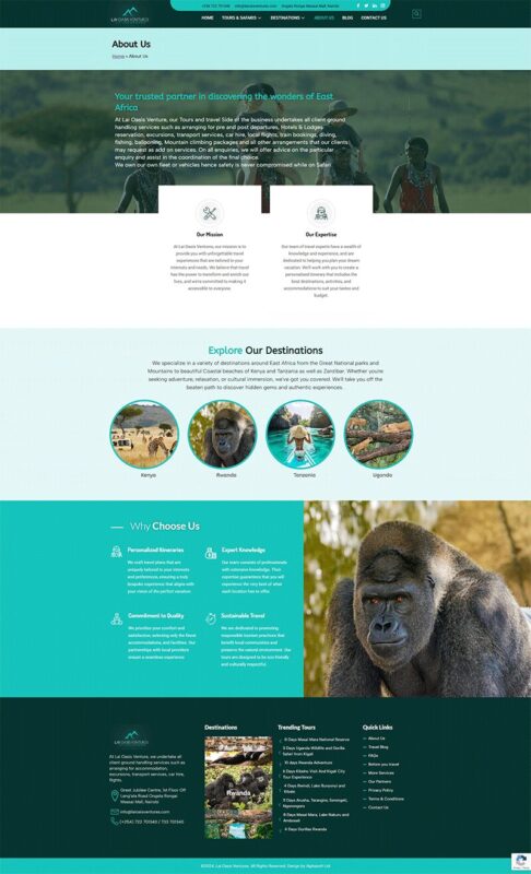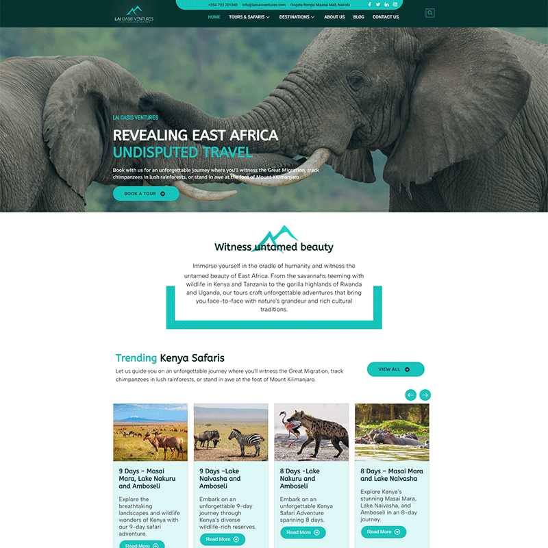 As part of our partnership with Lai Oasis Ventures, we designed a theme-based WordPress website to strengthen their digital reach in East Africa’s travel industry. The website presents their diverse tour services—from safaris and mountain climbing to hotel bookings and cultural adventures—through an engaging and intuitive platform.